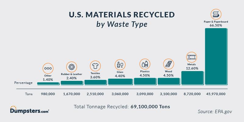 This is the current state of recycled materials by type. This implicitly hints at the value, ease of recycling, and amount produced for these materials. The question is how do these compare to the tonnage of those material types consumed? Knowing this could help identify critical areas to target and investigate